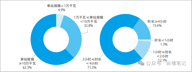 截至2024年底,全国新型储能项目单站规模10万千瓦及以上、储能时长2小时及以上的项目占比较高。单站规模10万千瓦及以上项目合计装机4596万千瓦,约占62%,单站储能时长2小时及以上/项目合计装机6386万千瓦,约占86%。从目前在建项目情况看,大型化、中长时新型储能项目呈增长趋势。