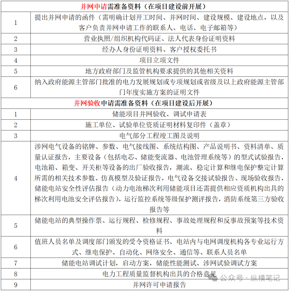 新型储能项目完工后,需通过电站消防验收(备案);向电网企业申请并网验收,合格通过后方可装计量装置并网运行。电网企业应按照积极服务、简捷高效的原则,建立和完善新型储能项目接网程序,向已经备案的新型储能项目提供接网服务;项目业主与电力调度机构签订并网调度协议,与电网企业签订购售电合同和高压供用电合同。参考广东省能源协会公布的新型储能并网流程,需准备资料如下: