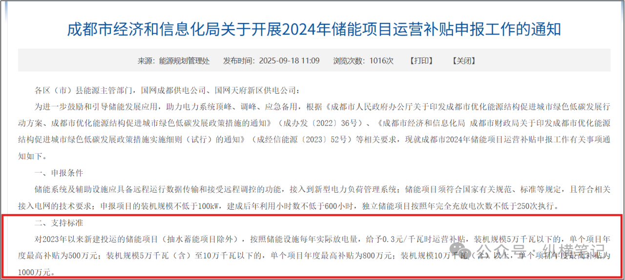 国家和地方为推动新型储能电站的应用和发展,会出台一系列的政策性补助措施、布局示范项目以及电价激励措施等。这些政策可能包括建设补贴、运营补贴等,具体因地区而异。四川省成都市具体补贴政策为:对2023年以来新建投运的储能项目(抽水蓄能项目除外),按照储能设施每年实际放电量,给予0.3元/千瓦时运营补贴,装机规模5万千瓦以下的,单个项目年度最高补贴为500万元;装机规模5万千瓦(含)至10万千瓦以下的,单个项目年度最高补贴为800万元;装机规模10万千瓦(含)以上,单个项目年度最高补贴为1000万元。