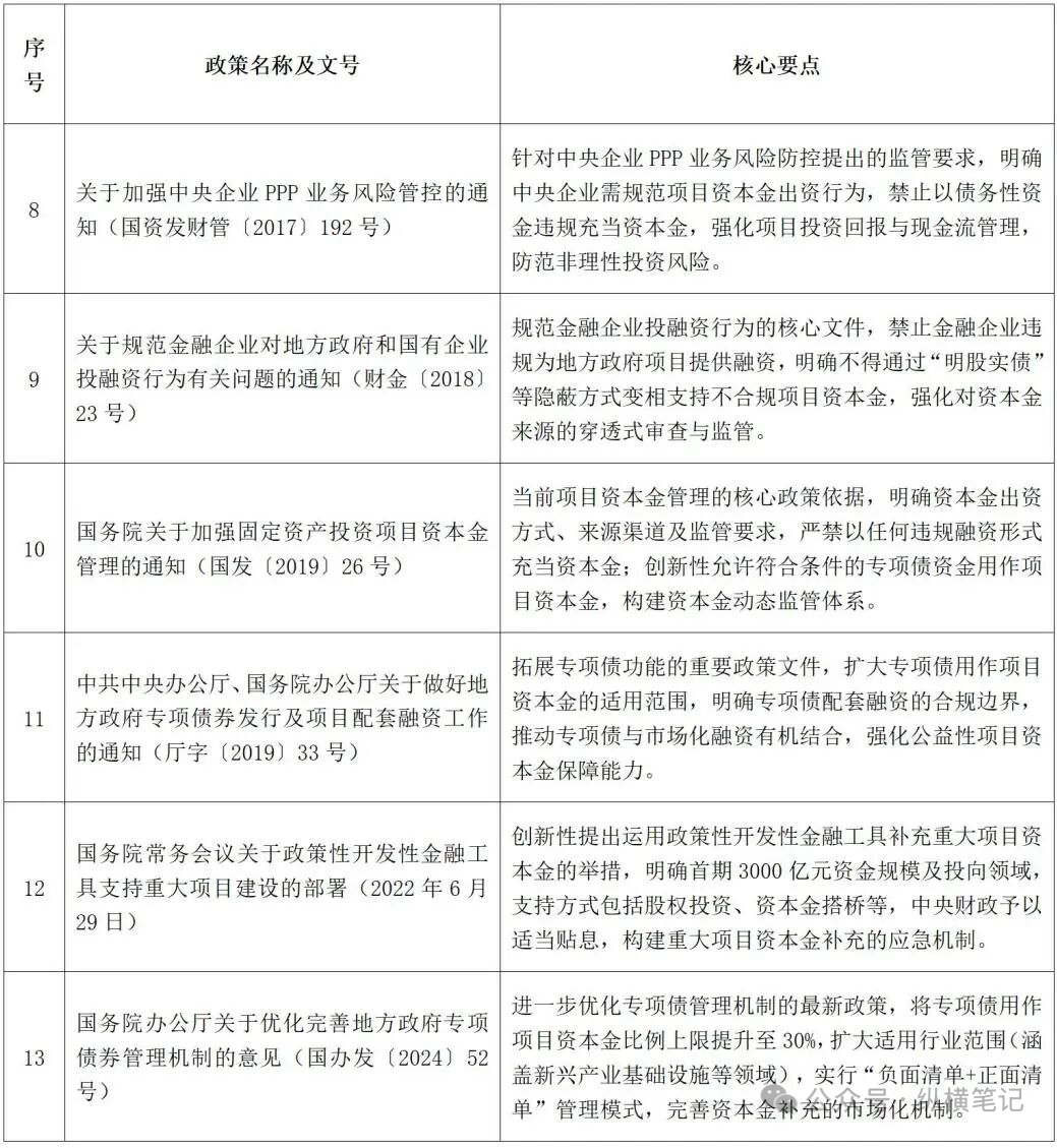 3.金融机构合规股权投资 在《中华人民共和国商业银行法》《保险资金运用管理办法》及银行业监督管理机构的监管框架下,金融机构除直接股权投资外,还可通过永续债等创新工具参与项目资本金配置。银行、保险等金融机构参与项目资本金的核心模式包括三类。 一是通过产业投资基金间接持股,聚焦国家重点支持的战略领域,实现资金投向的精准匹配。 二是保险机构以长期资金开展基础设施股权投资,凭借资金期限长的优势匹配基础设施项目的资金需求特征。 三是认购企业发行的永续债,依据《关于永续债企业所得税政策问题的公告》(财政部税务总局公告2019年第64号):“企业发行的永续债,可以适用股息、红利企业所得税政策”,即符合《金融负债与权益工具的区分及相关会计处理规定》(财会〔2014〕13号)关于权益工具的界定条件下,永续债可作为“权益性投资”计入项目资本金,其核心特征是无固定偿还期限、利息可递延支付,既契合金融机构的风险偏好,又为企业提供稳定资本补充。 此类项目资本金的筹集方式,依据监管要求需满足“风险可控、投向合规”原则,金融机构将对项目现金流稳定性、投资回报率进行全面评估,其优势在于资金规模大、适配大型项目需求,局限性则体现为资金成本相对较高且附带财务监管条款。 4.关联企业合规资金拆借 企业集团内部关联方之间的资金拆借,需严格遵循《企业会计准则第36号——关联方披露》及金融监管要求,在满足“资金来源合法、交易价格公允”核心前提下方可作为项目资本金。此类资金配置的核心优势在于集团内部资本统筹效率高,通过内部资金池运作降低交易成本,适用于集团化企业的跨项目资本调度。 需特别关注的是,依据财办金〔2017〕92号文规定,关联方资金不得通过“名股实债”等违规形式注入项目,需履行完整的资本验证程序,明确资金性质为权益性,避免因监管穿透认定为债务性资金而引发项目合规风险。 三、申请政策性金融工具作为资本金的要点 新型政策性金融工具是国家为实现政府特定政策目标,由中国人民银行支持国家开发银行、中国农业发展银行和中国进出口银行设立的特殊金融工具,投入形式可分为股权投资、股东借款和专项债资本金搭桥三种运作模式。 2025年下半年,新型政策性金融工具以5000亿元规模为首批核心,重点投向数字经济、人工智能、低空经济、消费领域基础设施、绿色低碳、农业农村、交通物流、市政和产业园区“8大核心方向”,专门用于补充重大项目资本金,以撬动社会投资、支持国家战略项目落地。 (一)政策性定位 由国家开发银行(重点支持基础设施、制造业)、中国农业发展银行(重点支持乡村振兴、城乡融合发展)和中国进出口银行(重点支持对外开放、制造业)发起,由政府主导设计、金融机构市场化运作的专项融资机制,通过发行金融债券筹集资金,重点投向基础设施、科技创新、产业升级等领域。解决重大项目资本金不足问题,避免资金断档,撬动社会资本,拉动总投资规模。 (二)项目申报遴选流程 (三)审核要点 1.项目重要性和投向 符合投向领域,符合政策性银行的主责业务。 2.项目真实性和成熟度 项目相关行政审批手续齐全,真实可信。 3.融资方案可行性 项目投资合理,筹资方案完备,资金来源已落实。基金申报金额不得超过国务院明确的各领域最低资本金比例的50%(重点领域可提升至80%),借款期限需与退出机制匹配。 4.基金申报主体合规性和资信度 借款人应为市场化主体(公司法人),不能是政府及其部门、事业单位等。 5.严格执行四项负面清单 严禁涉及土地储备、严禁涉足商业房地产、严禁涉嫌楼堂馆所、严禁触碰地方政府隐性债务。 四、总结 企业应锚定政策监管框架,科学进行项目资本金的统筹和配置,同时精准运用新型政策性金融工具,有效补充重大项目资本金缺口,为资本高效赋能实体经济、助推固定资产投资高质量发展筑牢支撑。 附《项目资本金相关制度文件梳理表》 文章已发表于四川纵横工程管理咨询有限公司微信公众号——纵横笔记,搜索公众号,可查看更多。
