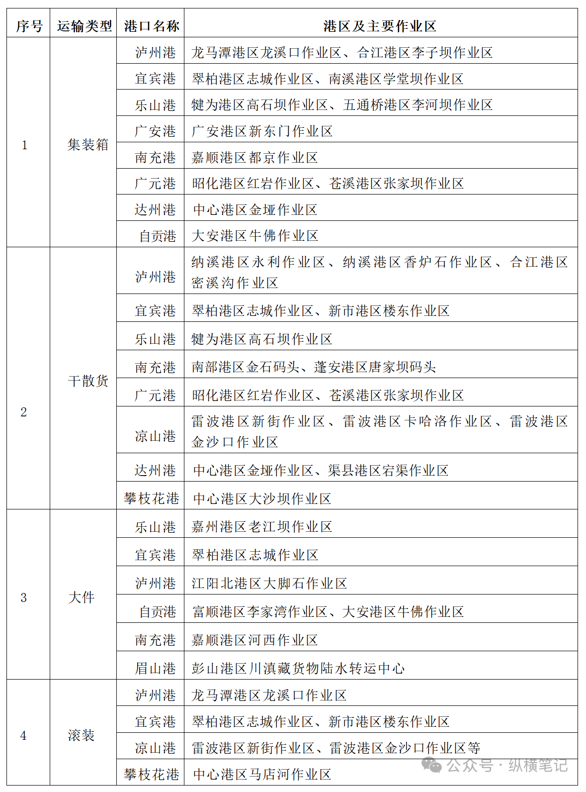 3、重点港口建设规划 全省共规划港口18个,其中具备千万吨货物吞吐能力的港口7个,构建“两核四翼多点”的现代化港口体系。 图:宜宾港口航运现场图 主要情况如下: 规划各运输系统专业化码头作业区: “两核”为泸州港、宜宾港2个主要港口;