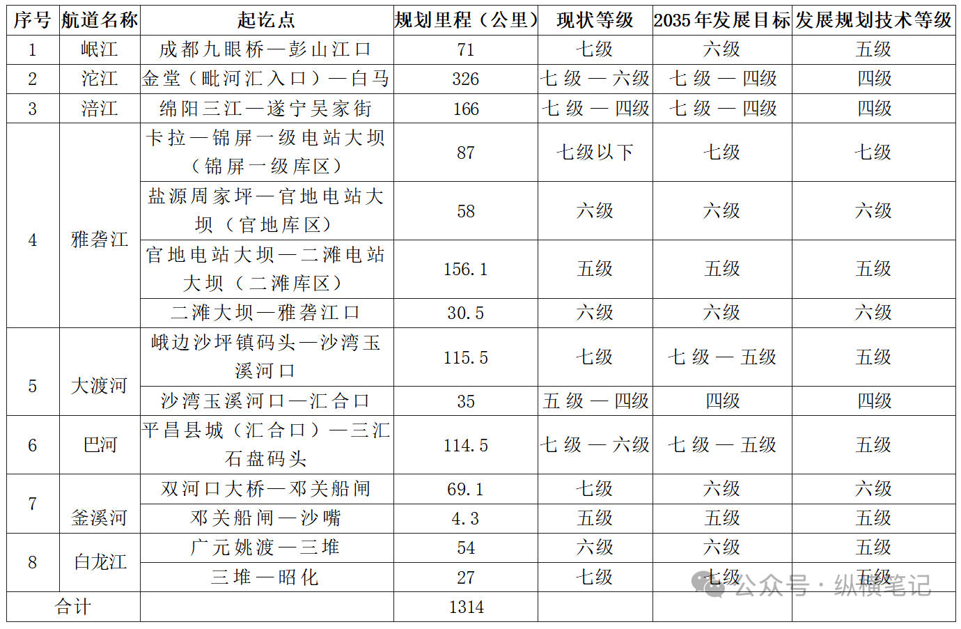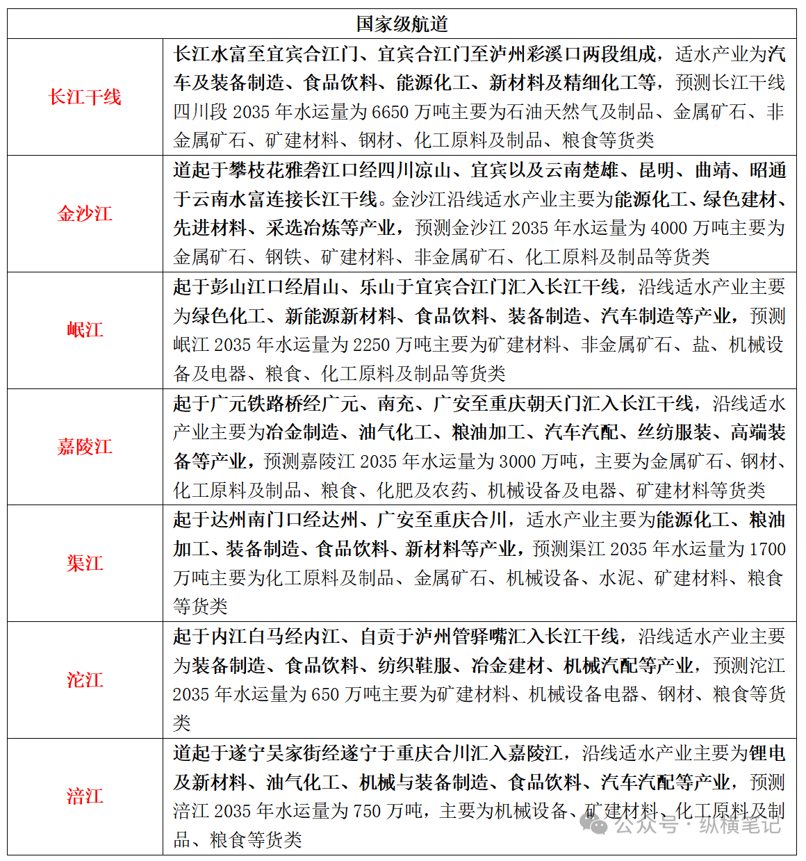 2、航道建设规划 地区重要航道:地区重要航道包括国家高等级航道延伸通道和服务乡村振兴的大型通航水库,规划岷江、沱江、涪江等航道的上游航道以及雅砻江、大渡河、巴河、釜溪河、白龙江等航道为地区重要航道,详情如下: 一般航道是指国家高等级航道和地区重要航道以外的等级航道,规划赤水河、青衣江、沐溪河等45段其他支流航道和18个湖库区航道为一般航道。