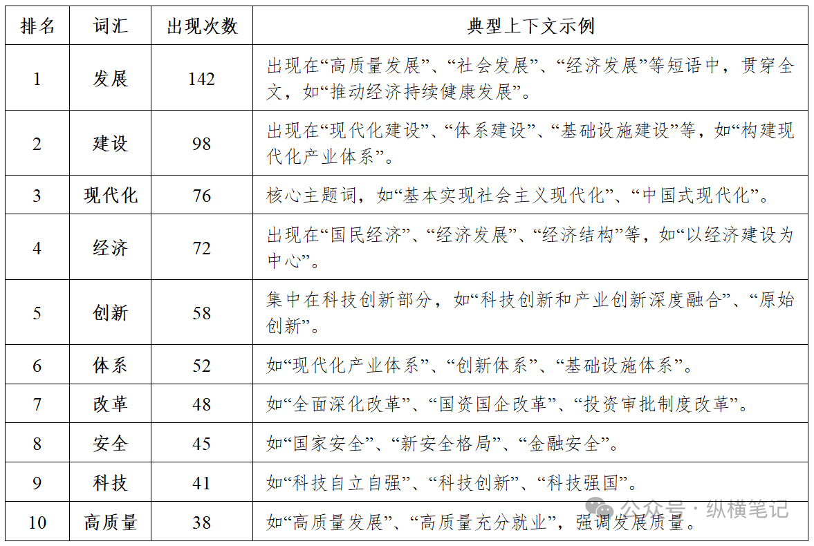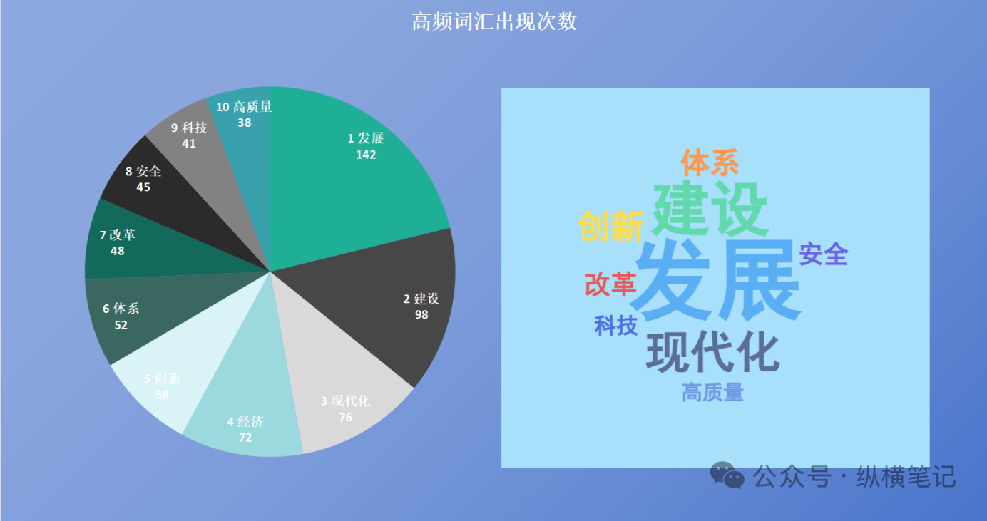 根据笔者统计,《建议》全文十大高频词汇依顺序分别是:发展、建设、现代化、经济、创新、体系、改革、安全、科技、高质量。