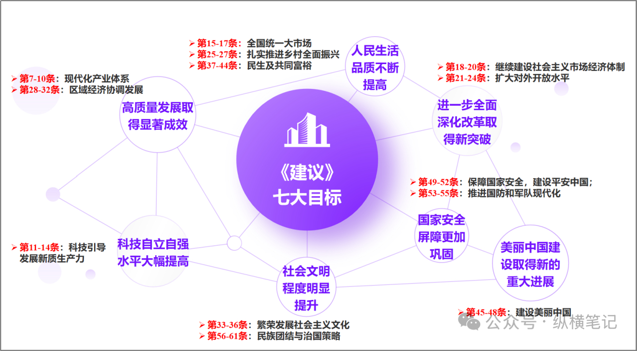 《建议》提出七大目标,作为细分任务拆解的统筹指引——高质量发展取得显著成效、科技自立自强水平大幅提高、进一步全面深化改革取得新突破、社会文明程度明显提升、人民生活品质不断提高、美丽中国建设取得新的重大进展、国家安全屏障更加巩固。