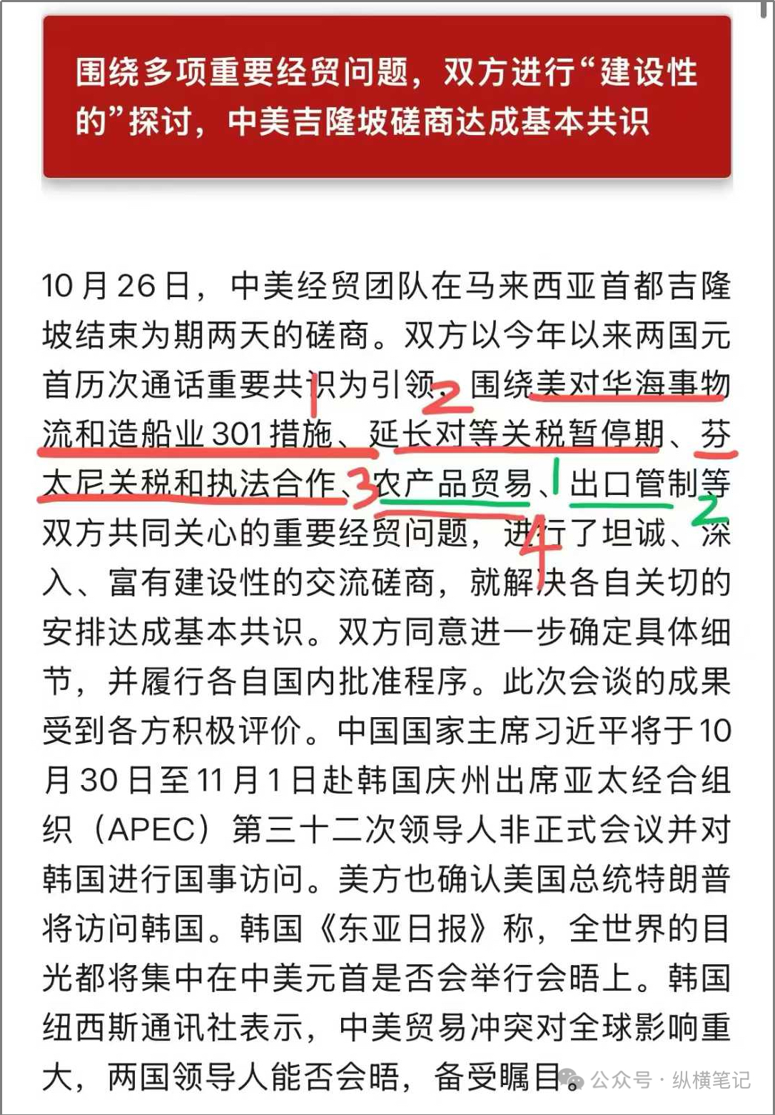 在该谈判中,红色4个是我们希望美国妥协的,绿色2个是美国希望我们妥协的。按重要度排序的话5张牌依次是:稀土(4分)、大豆(3分)、芬太尼(2分)、关税(1分)、征船费(1分)。本次没有直接提稀土管制,农产品也没有明说大豆,说明稀土和大豆仍然存在变量。可能谈判结果有附加条件:看美国修正的态度逐渐采购大豆、放宽稀土管制。