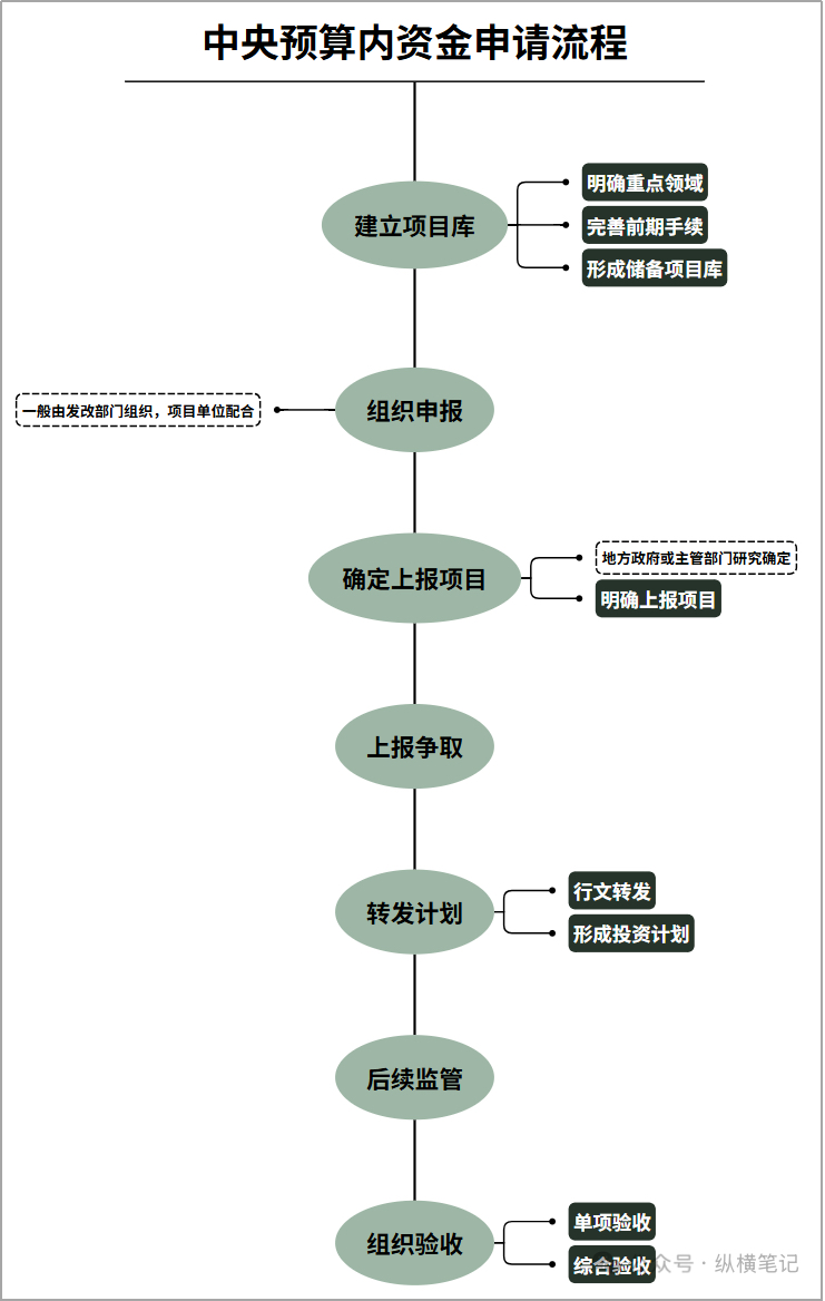 四、中央预算内资金的申报流程 中央预算内资金申报整体流程贯穿项目谋划、申报争取、计划下达、实施监管和验收评价等多个阶段。结合实际操作,中央预算内资金的申报流程大体可概括为以下六个环节。