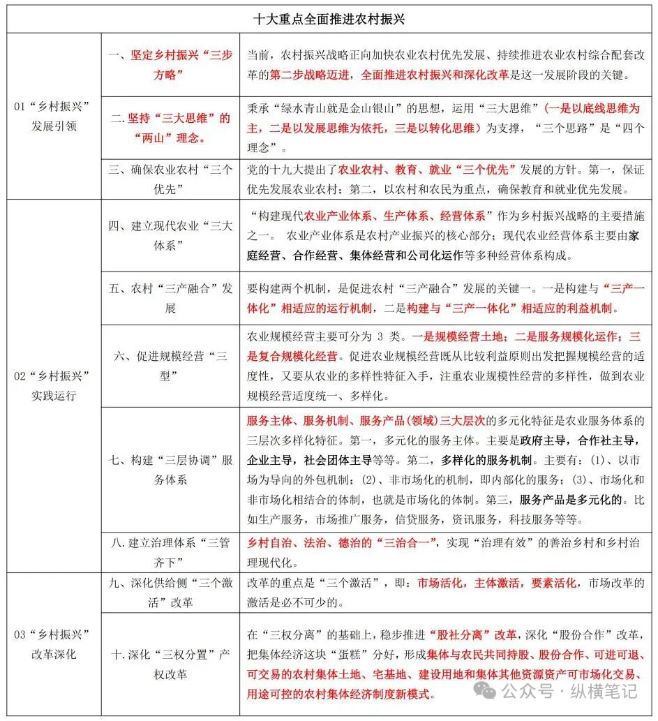 一、乡村振兴战略:核心要求与十大重点 要推进乡村振兴,首先得明确“往哪走、抓什么”。这份“战略蓝图”的核心的内容,必须牢记: (一)三大核心指引 【重点】2017年,党的十九大提出乡村振兴战略,为乡村的未来发展明确了方向,这三大内容是乡村振兴的“总纲领”,贯穿战略实施全过程: 1、“三步走”方略(明确时间节点): 2020年:乡村振兴取得重要进展,制度框架和政策体系基本形成; 2035年:乡村振兴取得决定性进展,农业农村现代化基本实现; 2050年:乡村全面振兴,实现“农业强、农村美、农民富”。 2、“二十字”总方针(明确发展目标): 产业兴旺、生态宜居、乡风文明、治理有效、生活富裕。 3、“五大抓手”(明确实施路径): 产业振兴(核心)、生态振兴(基础)、文化振兴(灵魂)、人才振兴(支撑)、组织振兴(保障)。 (二)十大重点任务(2024 年《人民日报》权威解读) “政策解读:全面推进农村振兴的十大重点”,于2024年11月18日由《人民日报》发布,点明“农村怎样才能更好发展”的路径和思路。 二、乡村振兴怎么干?五大振兴的“实践路径” 以产业兴村为带动,以生态立村为基础,以能人兴村为支撑,以组织兴村为保障,以文化兴村为灵魂,全面推进农村振兴。习近平总书记强调:“产业振兴是乡村振兴的重中之重”。围绕 “五大振兴”,各地已探索出可复制的经验: 1、产业振兴:做好“土特产”文章,让农村“有钱赚” 【重点】核心逻辑:产业振兴是农村振兴的重中之重,要落实产业帮扶政策,依托本地资源,延伸产业链、提升附加值,走“特色化+融合化”道路。 第一步:挖“特色”——以当地农业资源为基础,靠科技提品质、树品牌; 第二步:融“三产”——向下游延伸加工、物流、销售,向上游联动旅游、电商(如“农业+旅游”“农业+电商”); 第三步:强“主体”——鼓励合作社、家庭农场等新型主体,带动小农户参与产业链。 案例:宜宾屏山 资源优势:利用富硒土壤、金沙江地理环境,种植茵红李(2013年获 “全国农产品地理标志”); 模式创新:“国资公司+专合社+果农”联动——国资公司统一标准、创品牌、拓市场,果农专心种植; 成效显著:打造17万亩茵红李产业带,2024年预计产量15万吨、产值超9亿元;同时搞“赏花经济”,每年吸引游客11万人次,实现“一果带三产”。 2、生态振兴:守好“绿水青山”,让农村“住得美” 【重点】2024年12月农业农村部《关于加快农业发展全面绿色转型促进农村生态振兴的指导意见》明确:以“资源集约、废弃物利用、绿色低碳”为核心。 关键任务包括: 资源节约:推广节水技术(水肥一体化)、化肥农药减量、地膜科学使用; 废弃物利用:秸秆还田、畜禽粪污资源化、农村有机垃圾处理; 生态修复:推进长江/黄河流域农业生态保护,发展沼气、太阳能等清洁能源; 模式创新:推行“种养结合”“稻渔综合种养”等绿色循环模式。 3、文化振兴:留住“乡土魂”,让农村“有精神” 【重点】既要建 “硬件”(文化设施),更要护 “软件”(文化传承),遵循四大原则:一是文化引领,产业带动;二是以多种方式参与的农民主体;三是政府主导,市场运作;四是规划要科学,发展要有特色; 发力点:综合考虑现阶段农村经济社会发展需求和文化资源禀赋,从创意设计、演出产业、音乐产业、美术产业、手工艺、数字文化、其他文化产业、文旅融合等 8 个重点领域,赋予农村振兴生机。 具体行动:文化振兴体现在建设农家书屋、文化广场、文化活动室等文化设施,为农民群众提供文化活动场所,而在非物质文化遗产的传承上,更应该有所体现。通过开展文艺汇演、体育比赛、科技培训等丰富多彩的农村文化活动,使农民群众的精神文化生活更加丰富多彩。农村文化教育得到加强,农民文化素质得到提高。 4、人才振兴:育好“新农人”,让农村“有人干” 【重点】乡村振兴“关键在人”,核心是“内外结合”:既引外部高端人才,更挖本土人才潜力。 痛点破解:针对农村“人才外流”,重点激发本土人才(如返乡青年、种养能手、村干部)的技能与创新意识; 保障措施:优化农村教育资源、出台人才引进补贴、建好创新创业平台、完善社会服务(解决医疗、教育等后顾之忧)。 5、组织振兴:建强“战斗堡垒”,让农村“管得好” 【重点】以农村基层党组织为核心,筑牢治理根基: 选优配强“带头人”——抓好村党组织书记队伍建设; 壮大党员队伍——提升党组织凝聚力、战斗力; 联动其他振兴——把组织振兴与产业、生态等振兴结合,形成“党建引领+多元参与”的治理格局。 三、四川专属支持:乡村振兴的“用地保障”政策 当前乡村振兴进入“第二阶段”,“用地难”是不少地区的痛点。四川省针对性出台政策,为乡村振兴“腾空间”: 【重点】两大核心政策工具: (一)全域土地综合整治: 政策依据:自然资源部《全域土地综合整治实施指南(试行)》(2024 年 12 月); 整治方式:用“耕地占补平衡、城乡建设用地增减挂钩、农村集体经营性建设用地入市”三大工具,优化农村空间布局; 整治单元:以县为统筹、乡镇为实施单元,改善农民生活条件,推动三产融合。 (二)《四川省农村振兴用地政策指引 (2024 年)》: 政策定位:四川专属用地支持政策; 政策内容:明确农村产业发展、乡村建设、城乡融合等场景的用地倾斜,直接解决“乡村振兴没地用”的问题。 四、结语