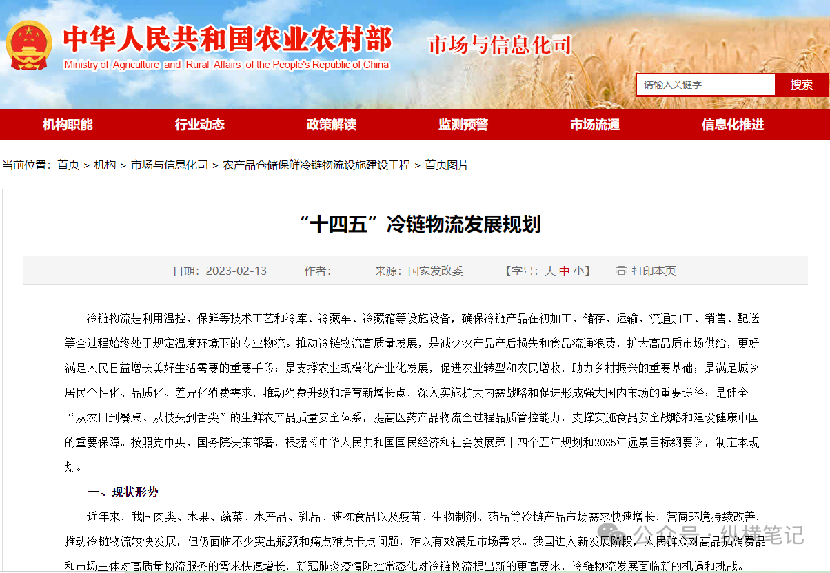 《农业农村部冷链物流和烘干设施建设专项实施方案(2023—2030年)》提出:到2025年,重点建设3.5万座仓储保鲜设施、250座产地冷链集配中心,实现新增产地冷链物流设施库容1000万吨以上;补上粮食产地烘干设施装备短板,粮食产地烘干能力达到65%。