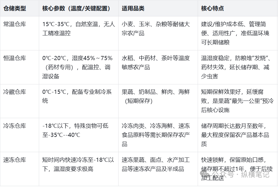 在物流活动过程中,仓库是必不可少的,不管是成品暂存、中转分拨,还是末端配送,都需要使用仓库。目前主流的农产品仓储分为常温、恒温、冷藏、冷冻、速冻五大类,各类型的温度、适用品类、核心特点清晰区分: