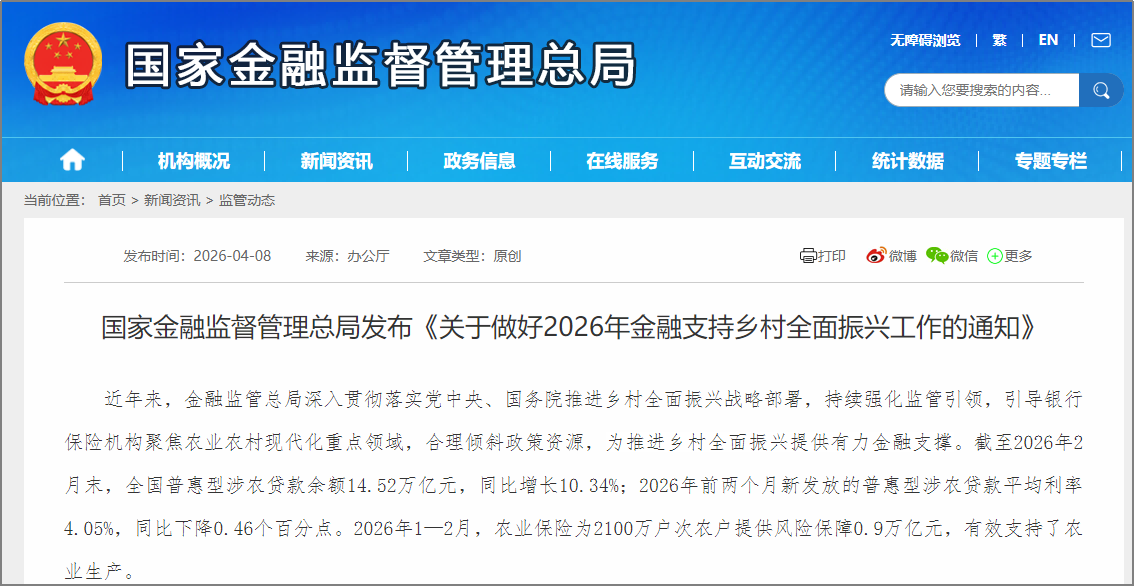 近年来,金融监管总局深入贯彻落实党中央、国务院推进乡村全面振兴战略部署,持续强化监管引领,引导银行保险机构聚焦农业农村现代化重点领域,合理倾斜政策资源,为推进乡村全面振兴提供有力金融支撑。截至2026年2月末,全国普惠型涉农贷款余额14.52万亿元,同比增长10.34%;2026年前两个月新发放的普惠型涉农贷款平均利率4.05%,同比下降0.46个百分点。2026年1—2月,农业保险为2100万户次农户提供风险保障0.9万亿元,有效支持了农业生产。 为深入贯彻落实中央农村工作会议精神,按照《中共中央 国务院关于锚定农业农村现代化 扎实推进乡村全面振兴的意见》有关部署,金融监管总局近日发布《国家金融监督管理总局办公厅关于做好2026年金融支持乡村全面振兴工作的通知》(以下简称《通知》)。 《通知》强调,银行业保险业要坚持农业农村优先发展和城乡融合发展,深入学习运用“千万工程”经验,不断健全农村金融服务体系,扎实做好常态化金融精准帮扶,提高农村金融服务质效,为推进乡村全面振兴、实现农业农村现代化提供有力支撑。 《通知》要求,持续强化重点领域金融供给,聚焦稳定粮油生产、“菜篮子”产业提质增效、农业科技创新等持续加大金融支持力度。积极助力培育壮大县域富民产业,坚持投资于物和投资于人紧密结合,助力发展各具特色的县域经济,助力培育农村消费新业态新模式新场景。有效支持乡村建设和城乡融合发展,加大对乡村振兴片区建设支持力度,鼓励银行机构出台专项信贷优惠政策。扎实实施常态化精准帮扶,健全常态化金融帮扶机制,聚焦防止返贫致贫对象和欠发达地区,进一步巩固提升金融帮扶的力度、精度和实效,助力守牢不发生规模性返贫致贫底线。 《通知》明确,2026年农业发展银行、大中型商业银行要继续单列涉农信贷计划,努力实现同口径涉农贷款余额较年初持续增长目标。引导大中型银行积极发展农业产业链金融,拓展首贷户,以改革促农村中小银行支农支小能力提升,合理确定普惠型涉农贷款内部倾斜政策,坚决防止并纠正“内卷式”竞争行为。优化涉农信贷产品和服务,结合“三农”特点提供更为适配的信贷产品,依法合规加大对涉农企业和农户贷款展期、续贷支持力度。强化稻谷、小麦、玉米、大豆保险保障,因地制宜发展地方优势特色农产品保险。发挥农业保险在防灾减灾中的作用。 《通知》指出,要着力优化农村金融服务环境,推动农村信用体系建设,加强涉农信息归集共享,充分发挥现代农事综合服务中心作用,加强农村金融与乡村治理深度融合。持续加强涉农信用风险监测,切实防范涉农贷款用于非农领域。严禁以涉农金融名义违规新增地方政府隐性债务。严禁与不法中介内外勾结、骗取贷款和保险理赔等行为。银行机构要加强对农村普惠金融服务点的日常监督和管理,切实防范非法集资等非法金融活动风险。 全文如下: 国家金融监督管理总局办公厅关于做好2026年金融支持乡村全面振兴工作的通知 金办发〔2026〕33号 各金融监管局,各政策性银行、大型银行、股份制银行,各保险集团(控股)公司、保险公司: 2026年,银行业保险业要认真落实《中共中央 国务院关于锚定农业农村现代化 扎实推进乡村全面振兴的意见》有关部署,坚持农业农村优先发展和城乡融合发展,深入学习运用“千万工程”经验,不断健全农村金融服务体系,扎实做好常态化金融精准帮扶,提高农村金融服务质效,为推进乡村全面振兴、实现农业农村现代化提供有力支撑。 一、持续强化重点领域金融供给 (一)全力保障农业综合生产能力和质量效益提升。聚焦稳定发展粮油生产,有力保障新一轮千亿斤粮食产能提升行动、粮食流通提质增效项目实施。聚焦“菜篮子”产业提质增效,助力生猪产能综合调控、肉牛奶牛产业纾困成果巩固、蔬菜生产稳定发展、深远海养殖捕捞、森林食品等多元化食物供给体系发展。聚焦农业科技创新,支持农业核心科技成果转化应用、种业振兴行动深入实施、农机装备研发应用、农业新质生产力因地制宜发展。积极稳妥探索金融支持耕地保护和质量提升、农业防灾减灾体系建设的有效模式。做好农业企业“走出去”金融服务,支持扩大优势特色农产品出口。 (二)积极助力培育壮大县域富民产业。坚持投资于物和投资于人紧密结合,助力发展各具特色的县域经济,培育中小企业特色产业集群,支持农民工稳岗就业。加大对绿色高效种养、农产品精深加工、农村电商高质量发展工程、农文旅融合、林草产业等领域的金融投入,带动农民增收致富。努力满足乡村消费扩容升级金融需求,助力培育农村消费新业态新模式新场景,支持新能源汽车、智能家电、绿色建材下乡等。做好进城农民等新就业群体购房安居、教育医疗、职业培训、就业创业等金融支持。 (三)有效支持乡村建设和城乡融合发展。加大对乡村振兴片区建设支持力度,鼓励银行机构出台专项信贷优惠政策。稳步加力对农村小型引调水工程建设、电网供电改造、充电设施覆盖、公路改造、物流通信、人居环境整治等基础设施建设和管护领域的金融支持。探索金融支持城乡融合发展和以县域为重要载体的新型城镇化建设的有效途径,促进城乡基础设施、基本公共服务供给一体化。 二、扎实实施常态化精准帮扶 (四)健全常态化