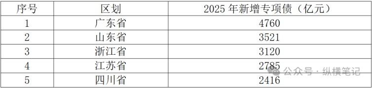 2025年全年,全国发行地方政府专项债券7.69万亿元。其中:新增地方政府专项债券4.61万亿元,再融资专项债券3.08万亿元。其中发行金额前五的省份依次为广东省、山东省、浙江省、江苏省和四川省。